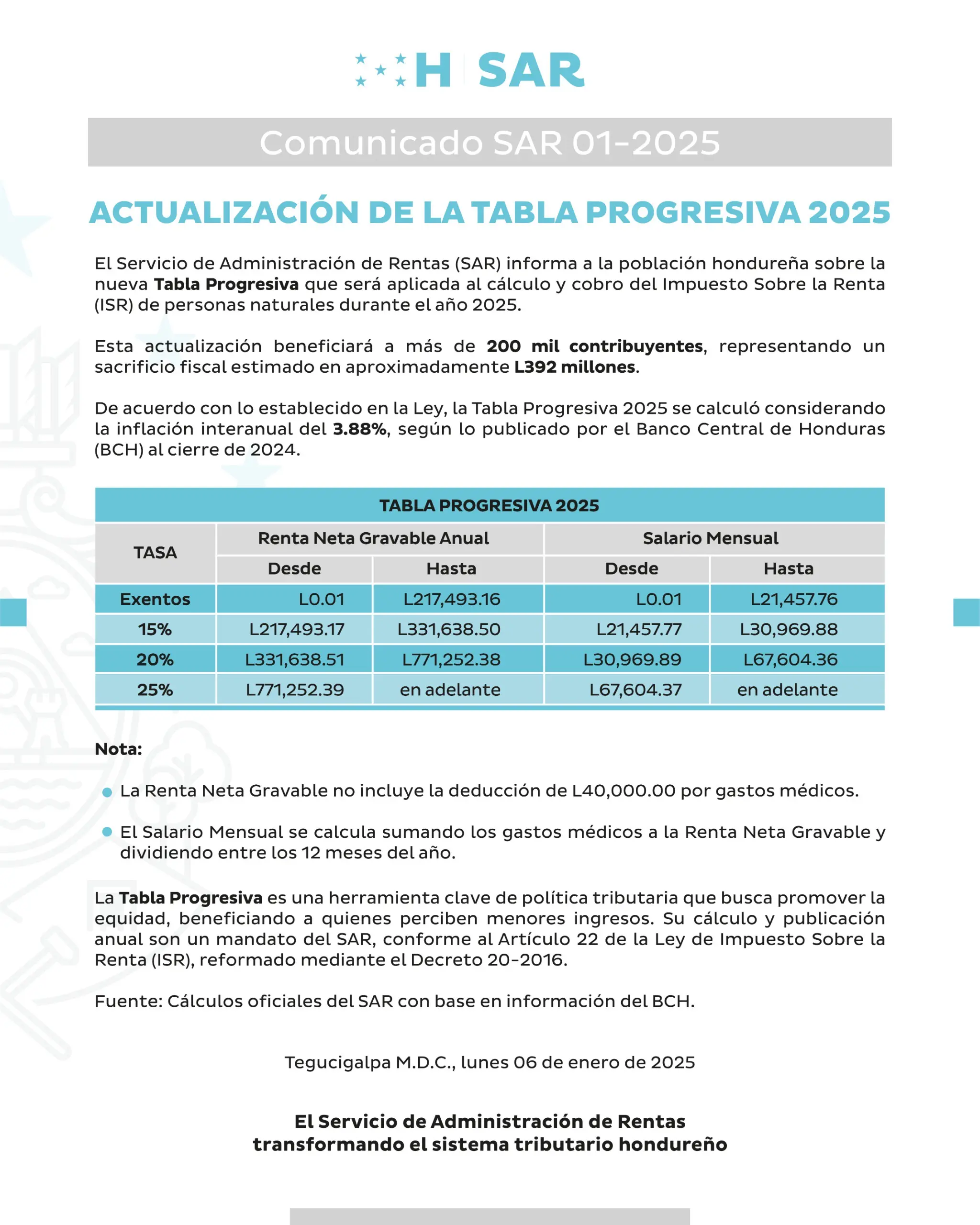 El Servicio de Administración de Rentas (SAR) anunció al pueblo hondureño la nueva Tabla Progresiva 2025 que será aplicada al cálculo y cobro del Impuesto Sobre Renta (ISR) de personas naturales.